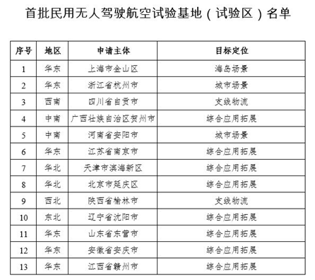 【行业资讯】民航局公布首批民用无人驾驶航空试验基地,共13个